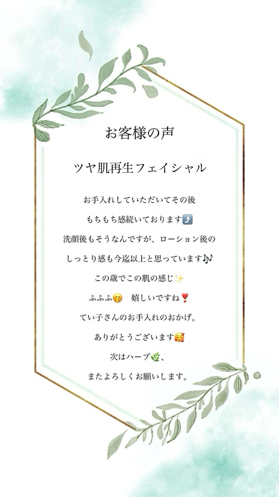 トリートメント直後、翌日はもちろんですが、むしろ1週間後位からの方が効果を実感いただけると思います。お肌の内側がぐんぐん元気になってくる感じ。日が経つにつれお肌の調子が良くなってきます。