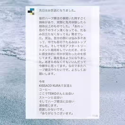3週間に1回のペースで通っていただき、12月にハーブ療法を。顔が一回りも二回りも小さくなりました。目の下のたるみのお悩みが改善。